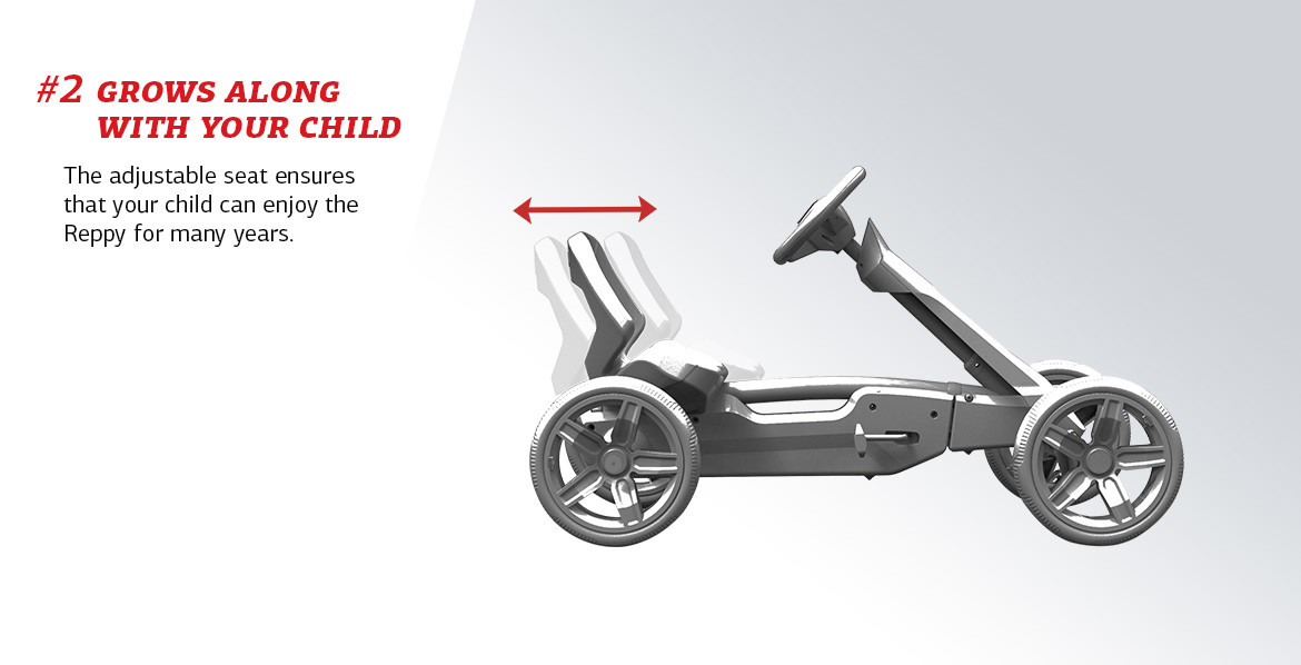 Завдяки дизайну від BMW, низькому ковшеподібному сидінню та яскравому спортивному керму веломобіль видно здалеку. Стильний та безпечний веломобіль BERG Reppy легкий та компактний, його зручно зберігати після прогулянки. Сидіння Reppy легко регулюється поворотом ручки, інструменти не потрібні.