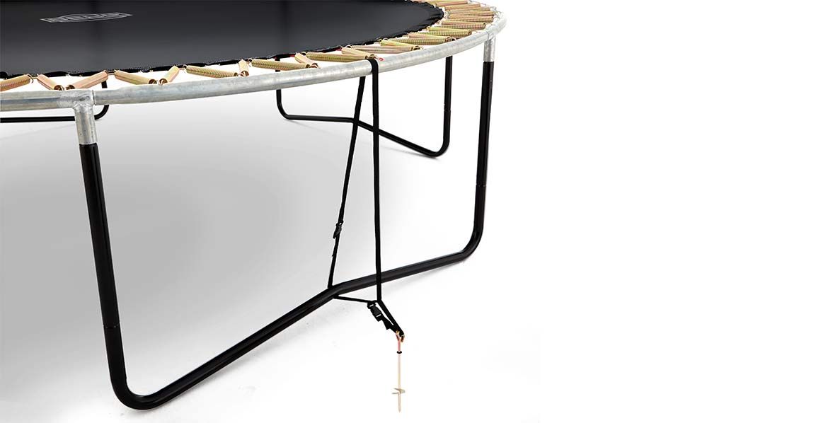 Батут можна закріпити на землі за допомогою анкерного комплекту BERG, щоб запобігти його зсуву під час стрибка, пориву вітру або інших несприятливих погодних умов.