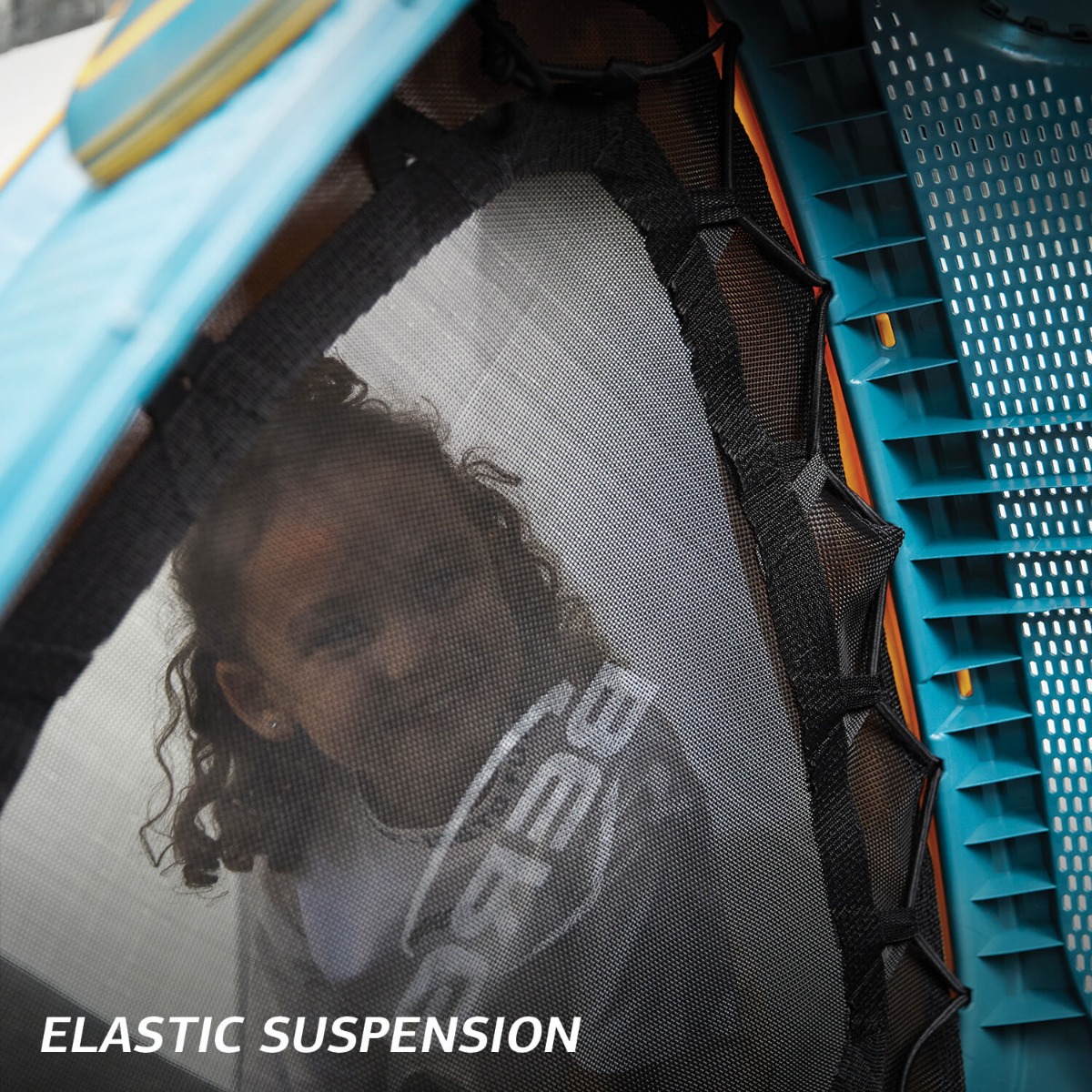 Hoppaa дуже безпечний завдяки протиковзким ніжкам під батутом, які міцно тримають його на землі. Батут також виготовлений з безпечних матеріалів: край оснащений амортизуючими повітряними накладками, які амортизують будь-яке падіння. Випадково стрибнули поруч із килимком? Ви завжди робите м’яку посадку завдяки м’якій піні навколо захисного краю.